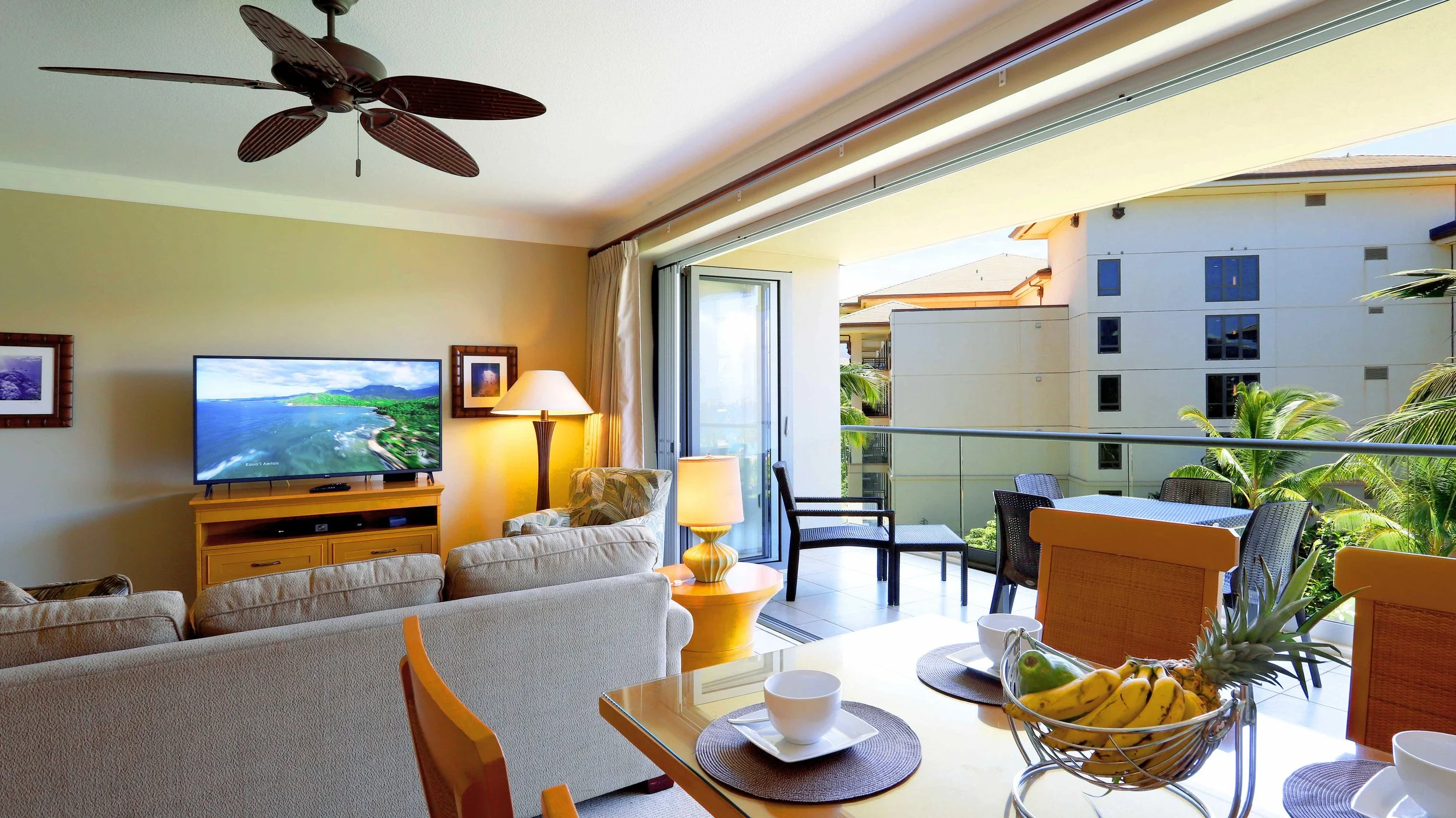 Maui lifestyle indoor/outdoor living - Bi-folding glass walls open to outside covered lanai(balcony) with glass rail/walls for wonderful views