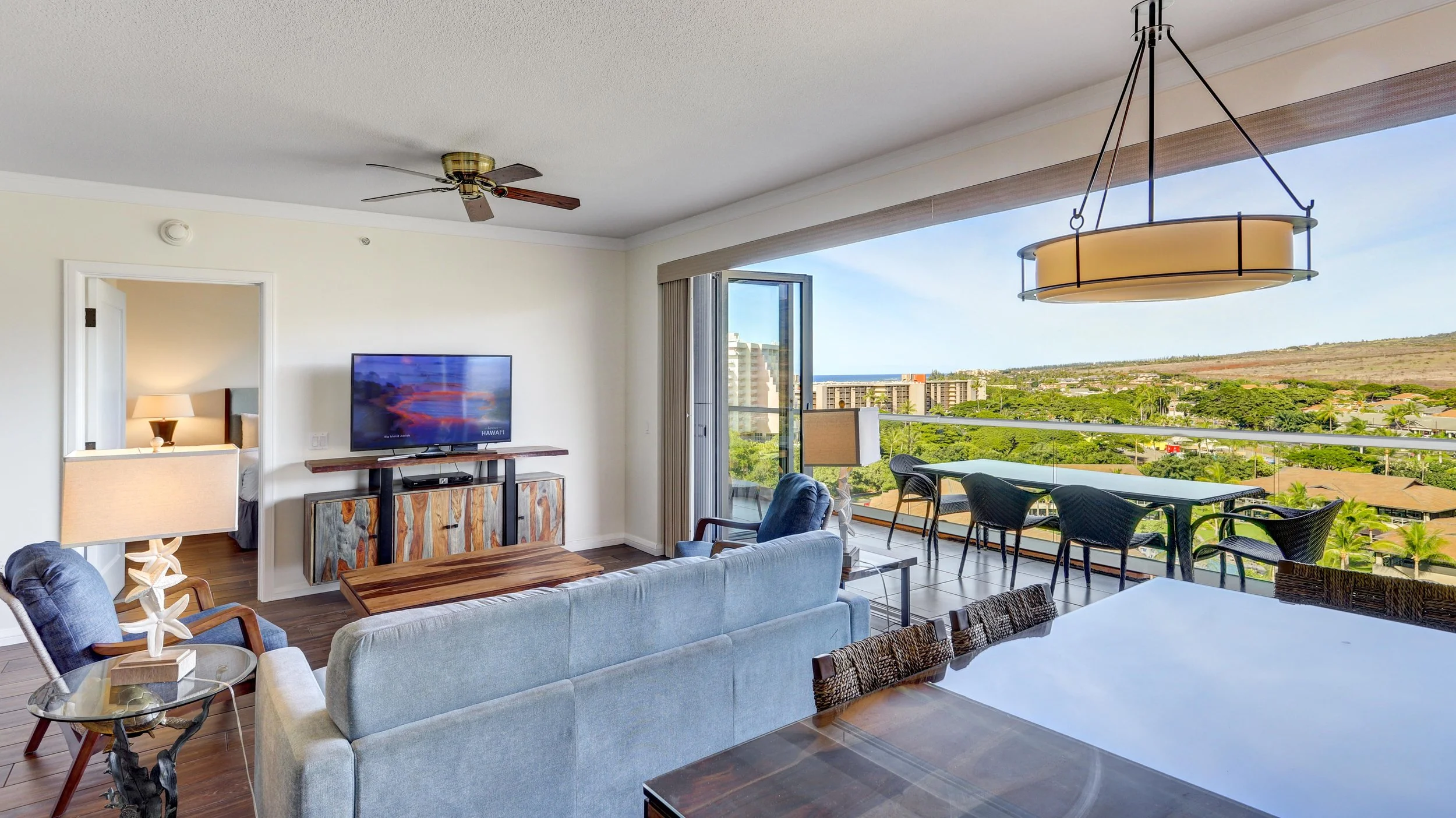 Maui resort indoor/outdoor living - Bi-folding glass walls open to outside covered lanai(balcony) with glass rail/walls for wonderful views