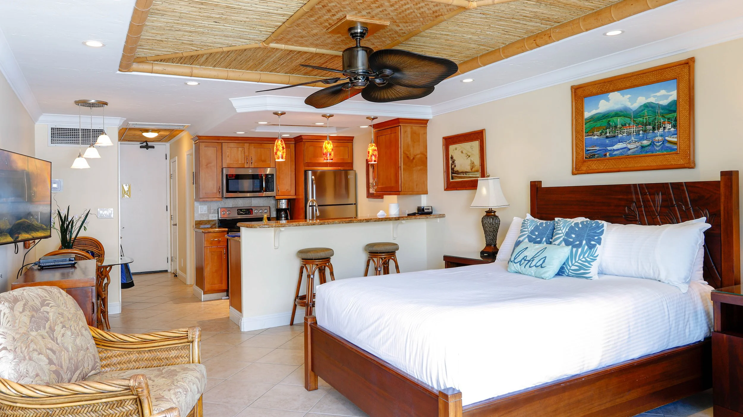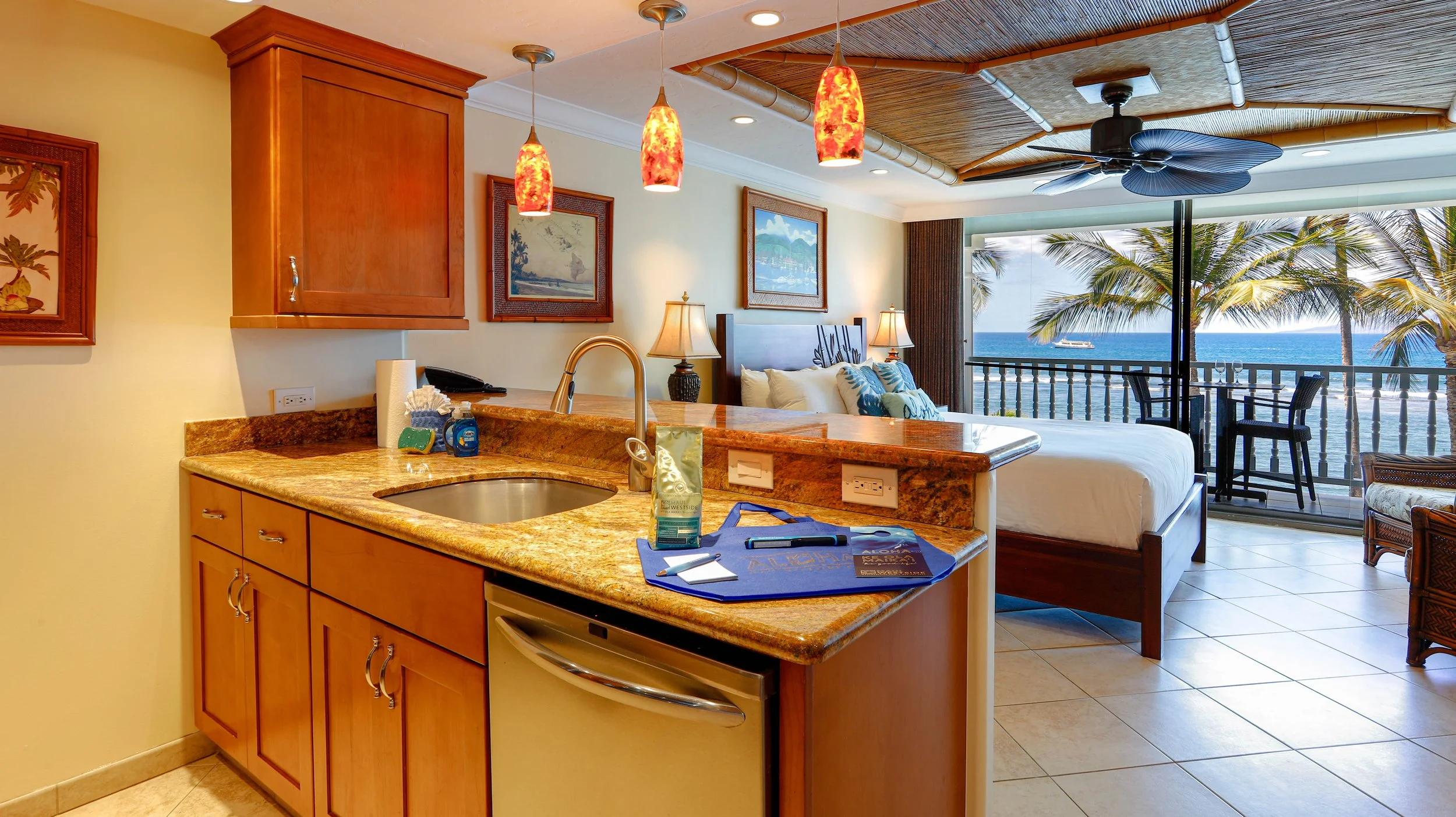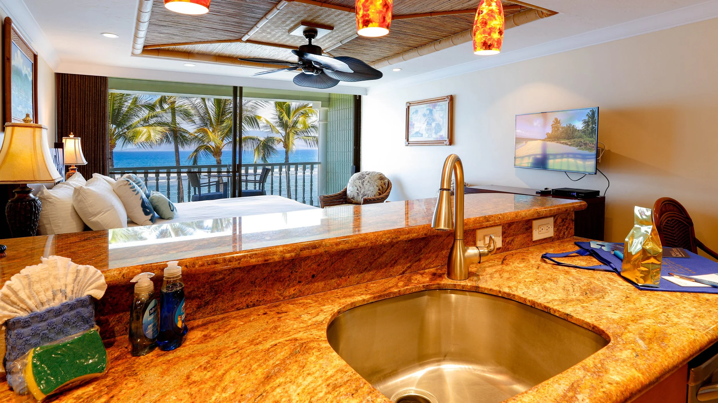 This oceanfront studio is designed for two guests, featuring a comfortable king-size bed, a fully equipped kitchen, and a bright living area that opens directly onto the lanai. With central air conditioning, ceiling fans, and island-inspired décor, you’ll have everything you need for a relaxing Maui retreat.